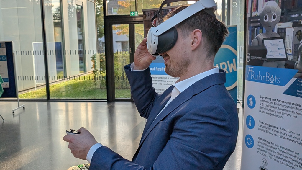 Am 4. Juni 2025 lud die HRW erstmals zum Exploration Day. Gewohnte Pfade verlassen, Netzwerken, Neues lernen und entdecken. Das RuhrBots-Team stellte dabei verschiedene Arbeiten des Kompetenzzentrums vor. Im Mittelpunkt stand die entwickelte VR-Anwendung, mit der Besuchende in eine virtuelle Bibliotheksumgebung eintauchen und verschiedene Interaktionen mit einem Serviceroboter durchführen und erleben konnten. Darüber hinaus wurden …