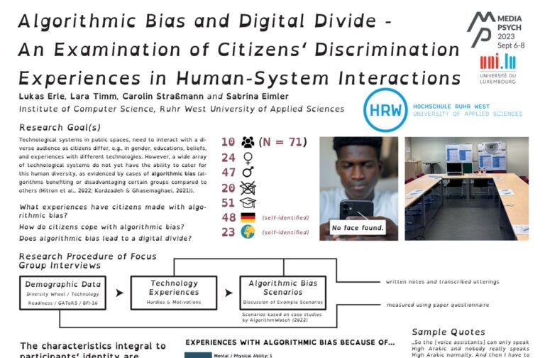 In Fokusgruppen mit 71 Personen wurde untersucht, welche Erfahrungen Bürger*innen mit algorithmischem Bias machen, wie sie damit umgehen und ob dadurch ein digitaler Graben entsteht. Etwa ein Viertel der Teilnehmenden berichtete von Diskriminierungserfahrungen, besonders häufig nichtdeutsche Personen. Trotz Bias-Erlebnissen bleibt das Vertrauen in Systeme hoch.