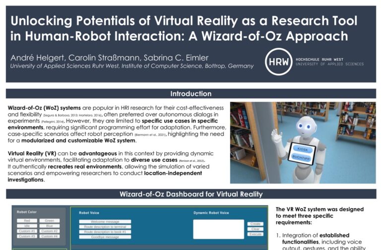 Das Virtual Reality Authoring Tool soll diese Hürden abbauen und Forschenden in der Mensch-Roboter-Interaktion eine einfache, flexible Infrastruktur bereitstellen. Es bietet sofort nutzbare Roboter, Umgebungen und Messmethoden wie Eye- oder Motion-Tracking. Durch seine Anpassungsfähigkeit an verschiedene Szenarien ermöglicht es barrierefreien Zugang zu VR-Forschung – jederzeit, ortsunabhängig und ohne technische Vorkenntnisse.