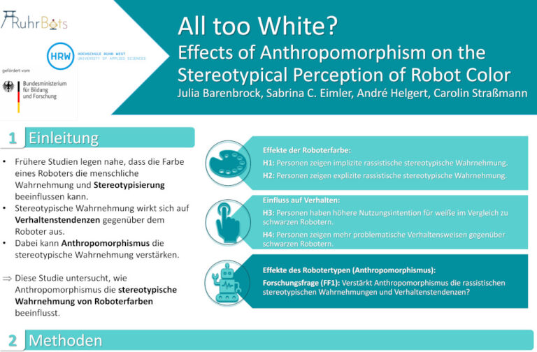 In einer Online-Studie mit 100 Teilnehmenden wurde untersucht, wie Roboterfarbe und Anthropomorphismus die Wahrnehmung und Bewertung von Robotern beeinflussen.